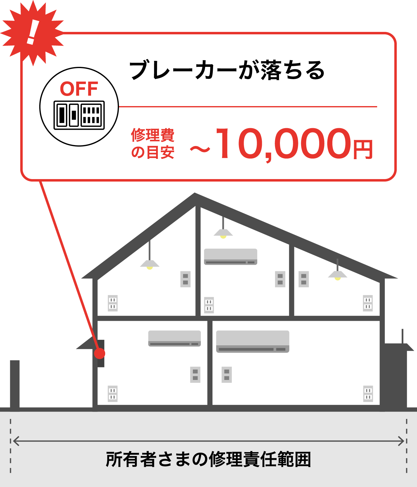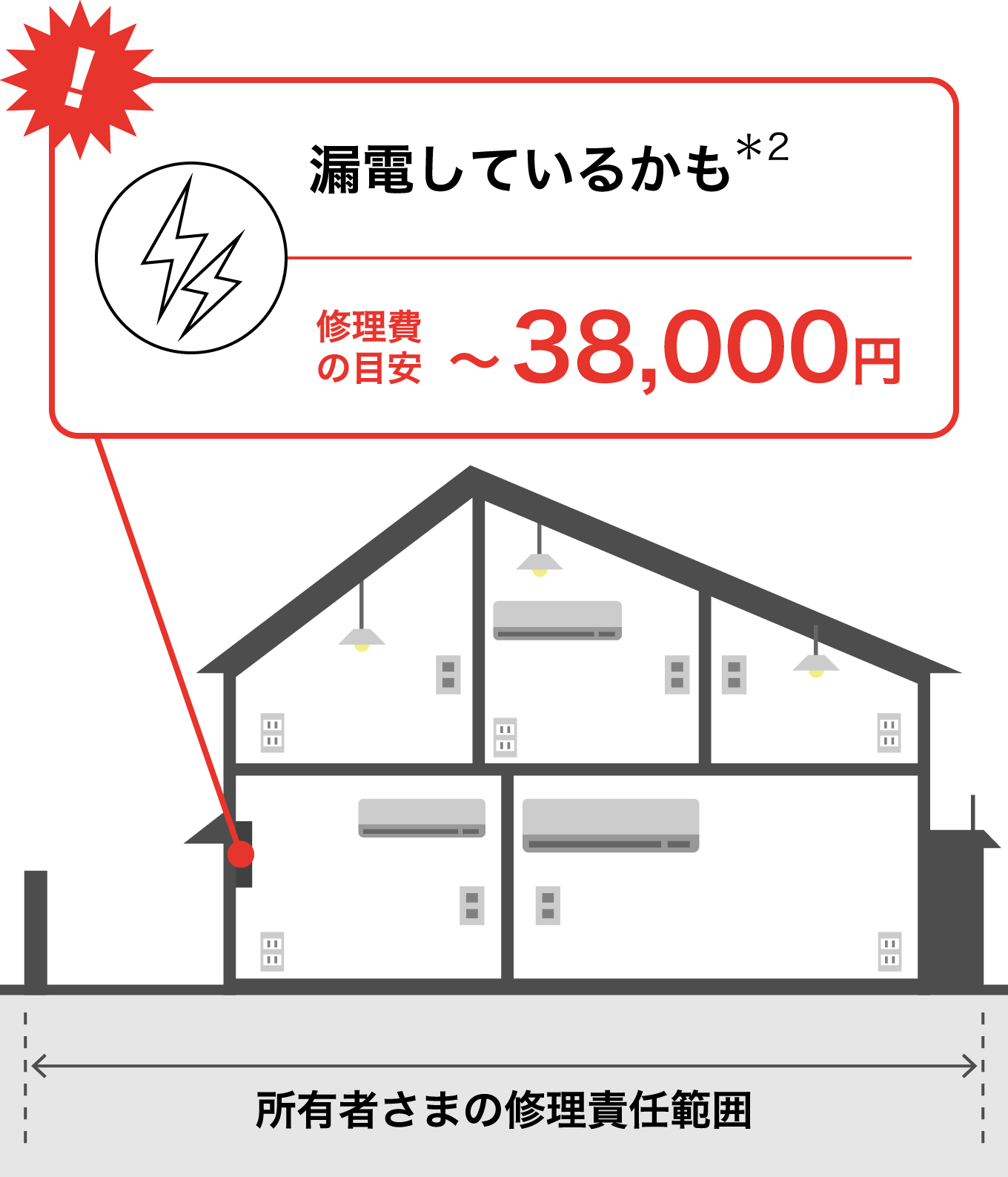 漏電ブレーカーが落ちる、分電盤から異音がする等、漏電が疑われる事象がある場合に調査を含む修理をご依頼いただけます。