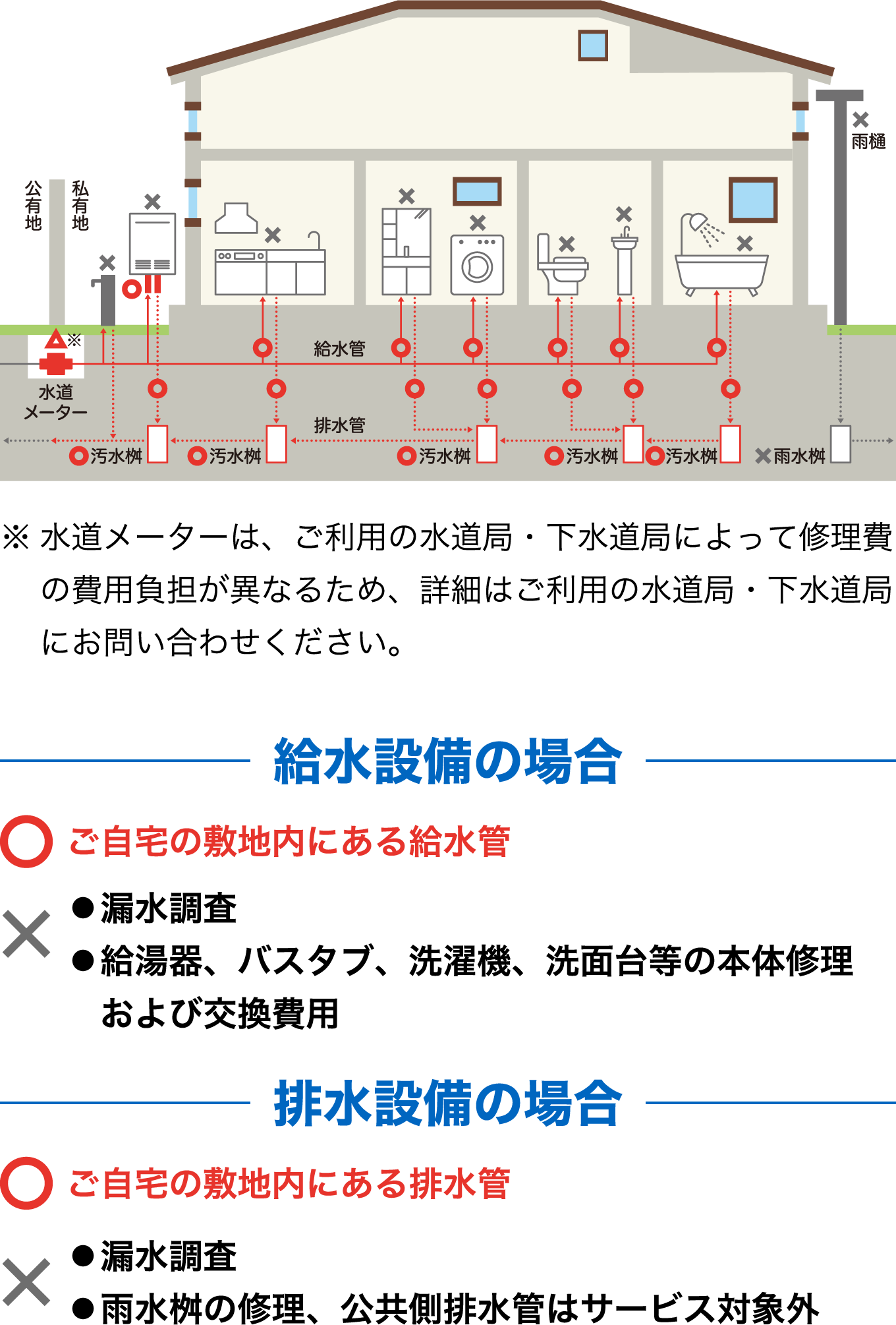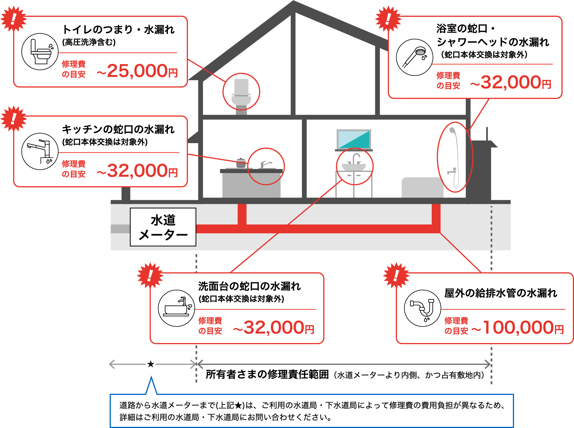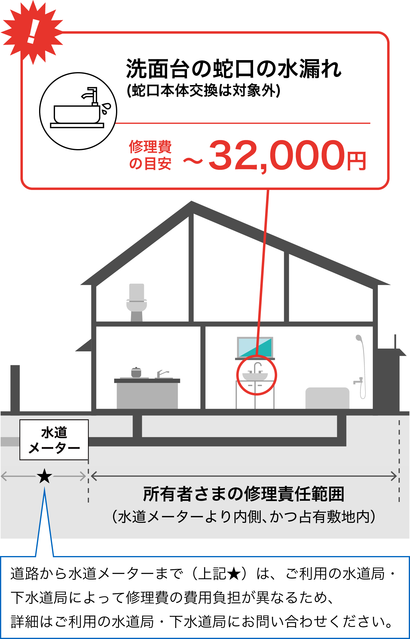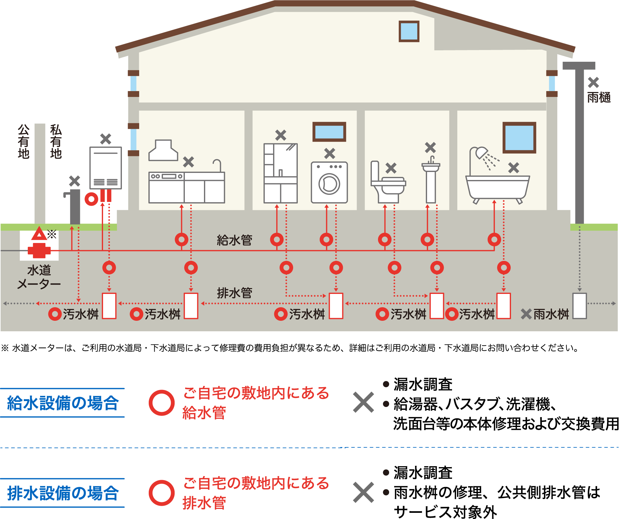 ※漏水箇所を特定できない場合の追加調査等、応急措置の範囲を超える修理作業はサービス対象外です。