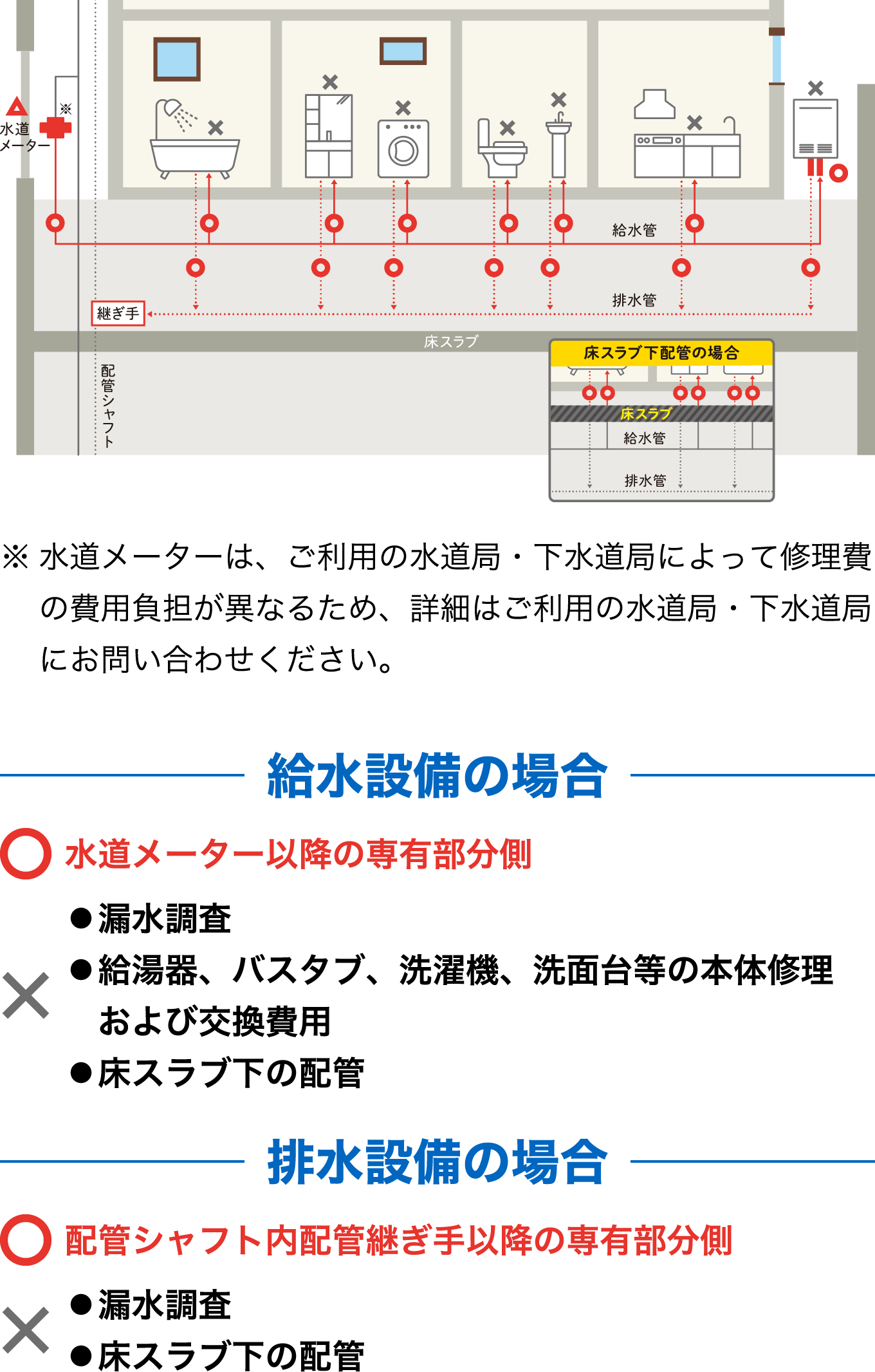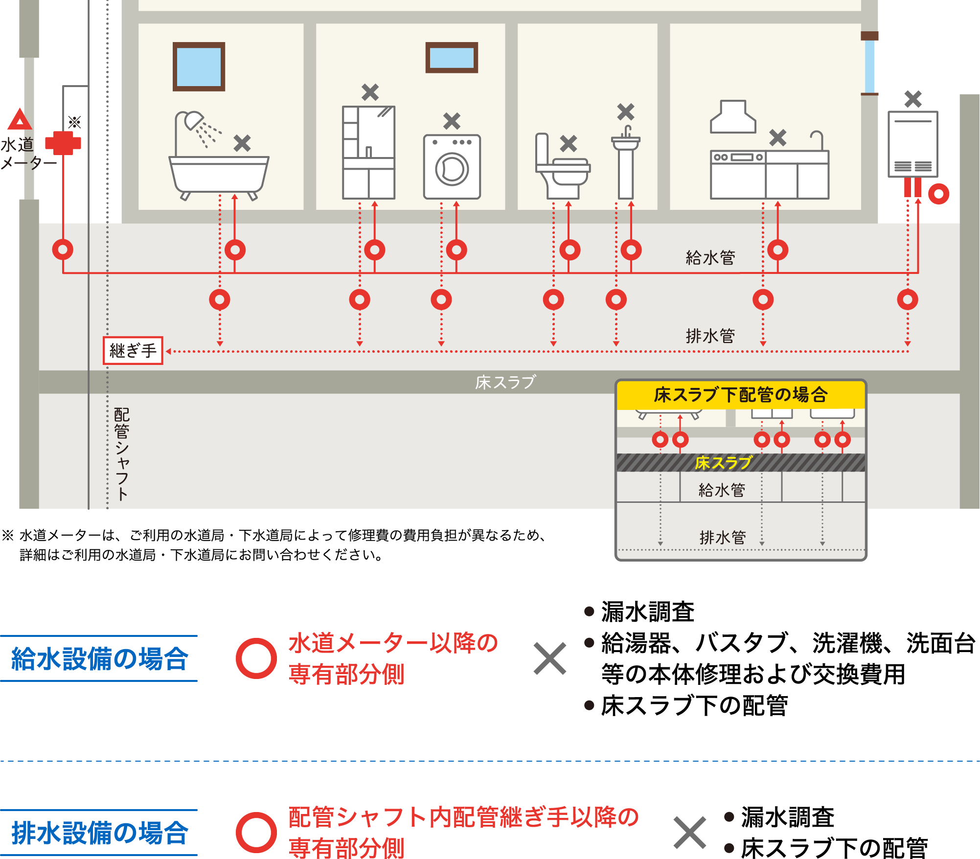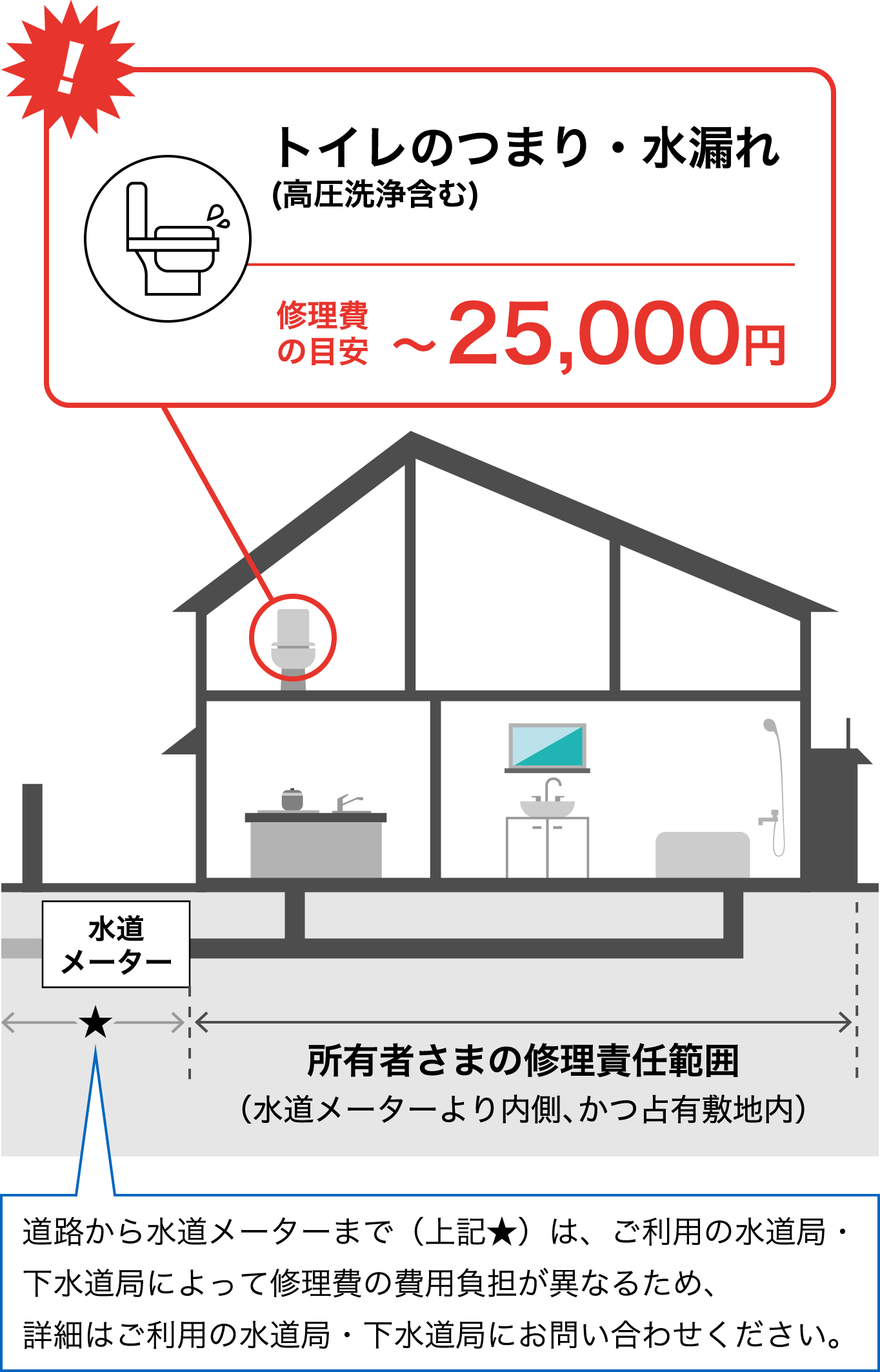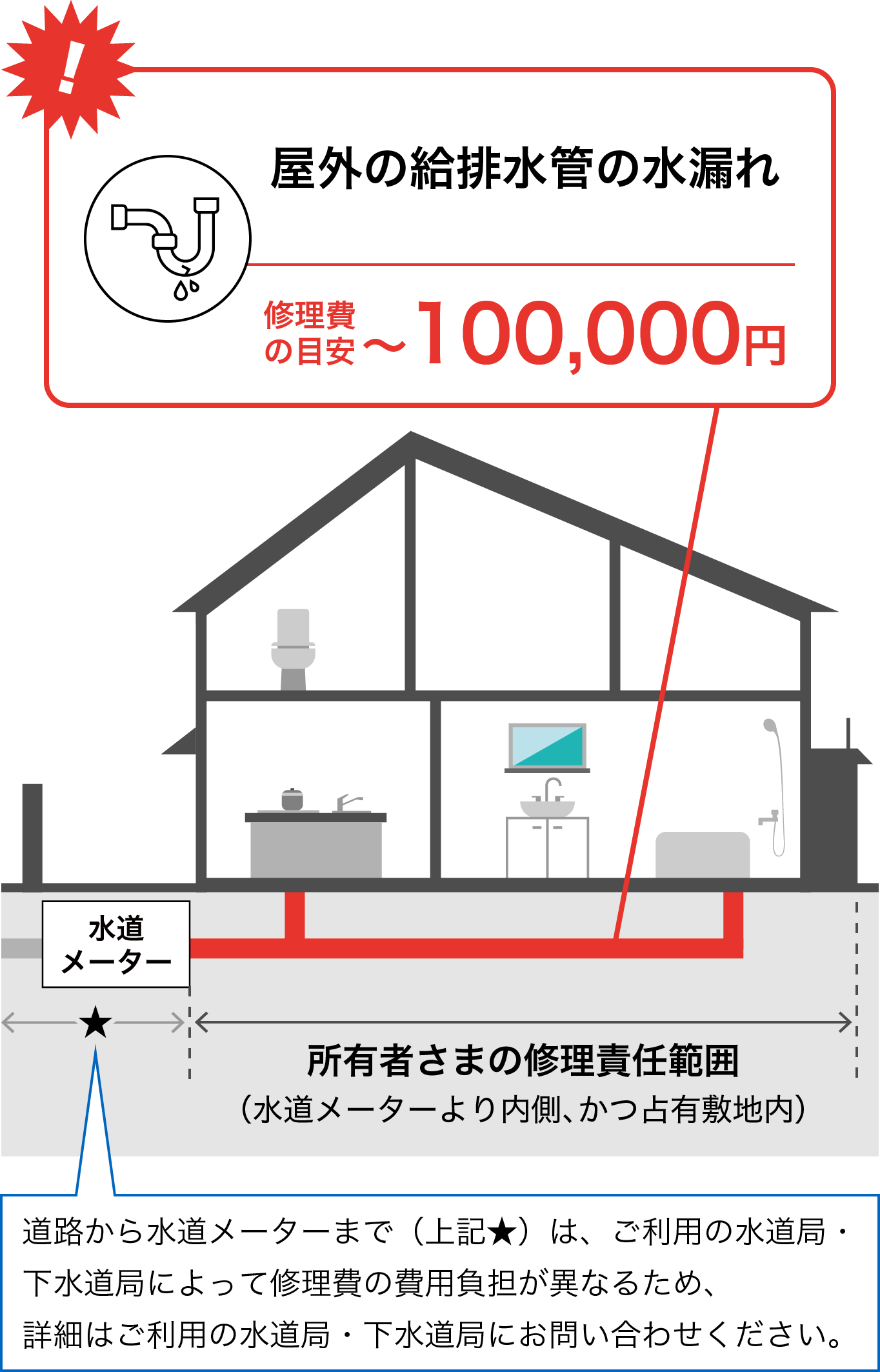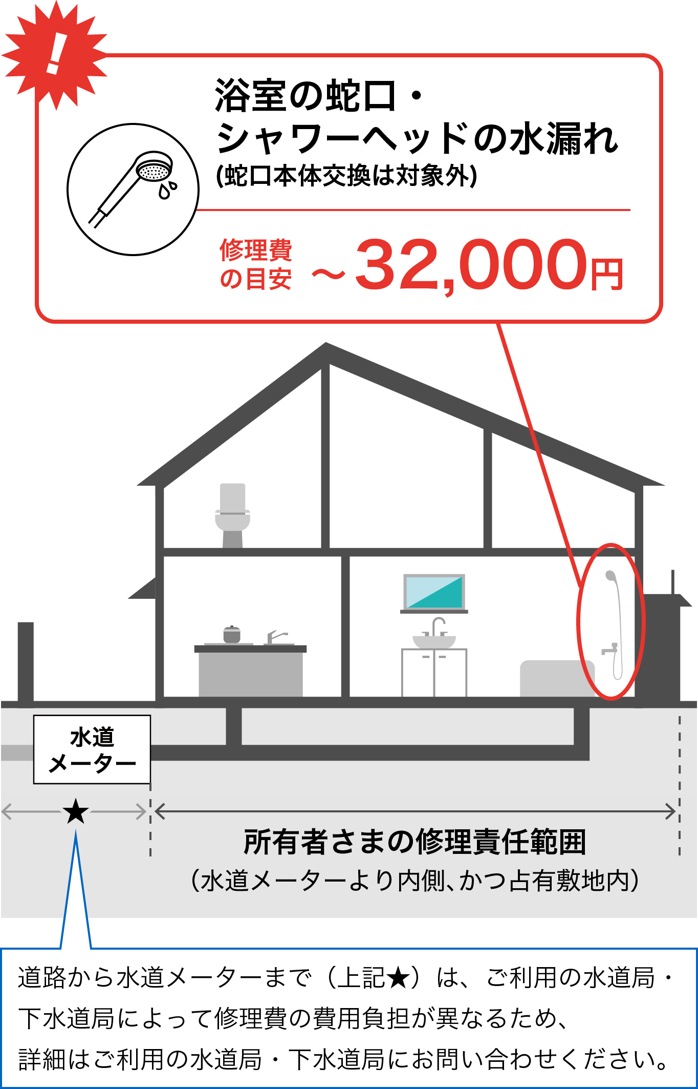 ※漏水箇所を特定できない場合の追加調査等、応急措置の範囲を超える修理作業はサービス対象外です。